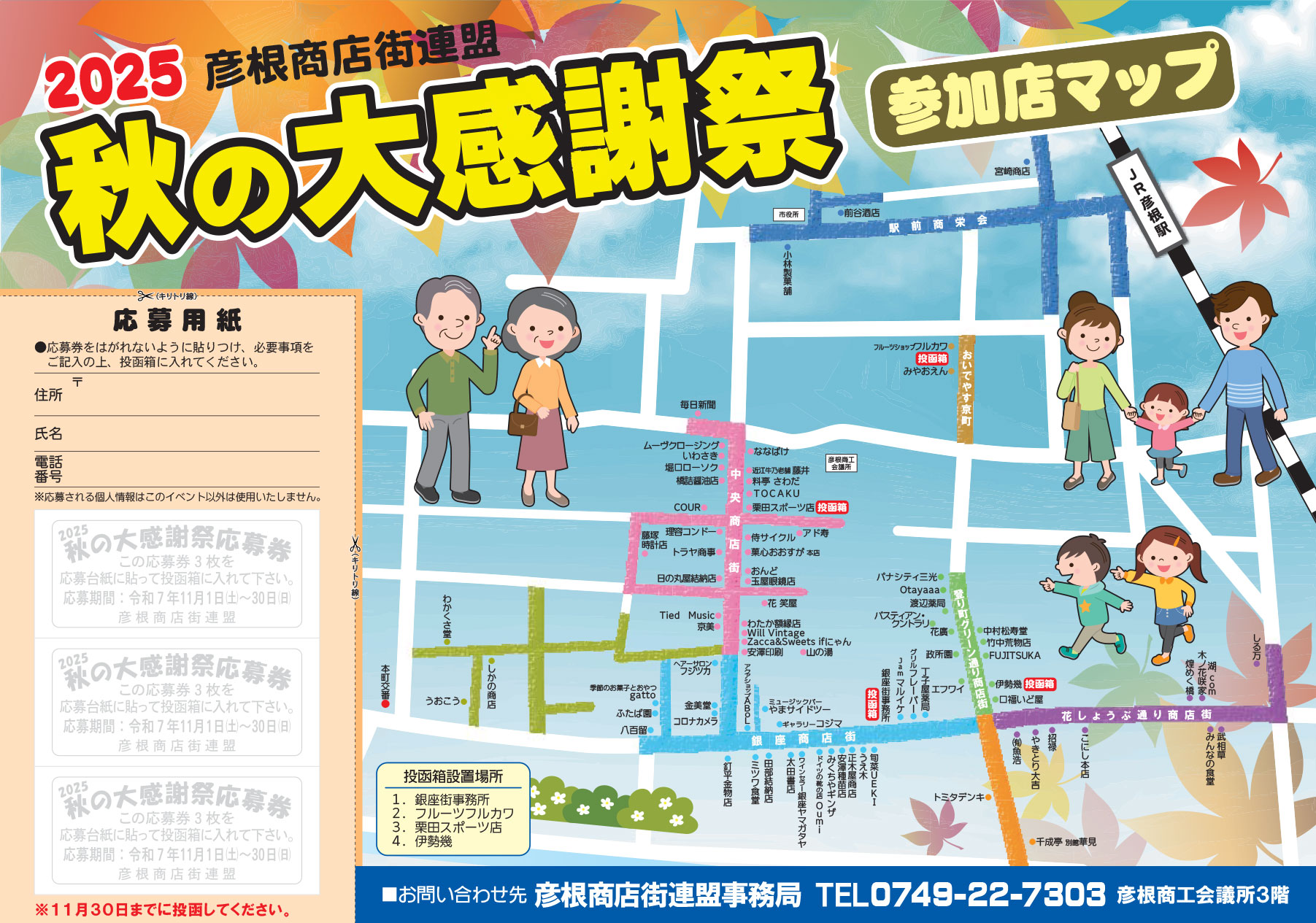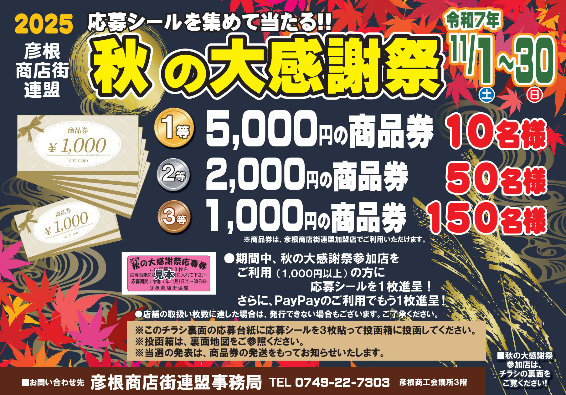 彦根商店街連盟では、「秋の大感謝祭」と題して、応募シールを集めて応募すると抽選で商品券が当たるキャンペーンを実施いたします。